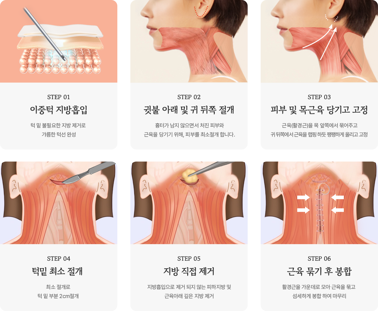 1단계: 이중봉합절개 부위를 꼼꼼하게 봉합하여 절개선의 흔적이 남지 않도록 이중 봉합을 진행합니다.