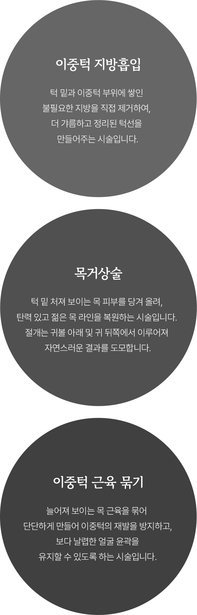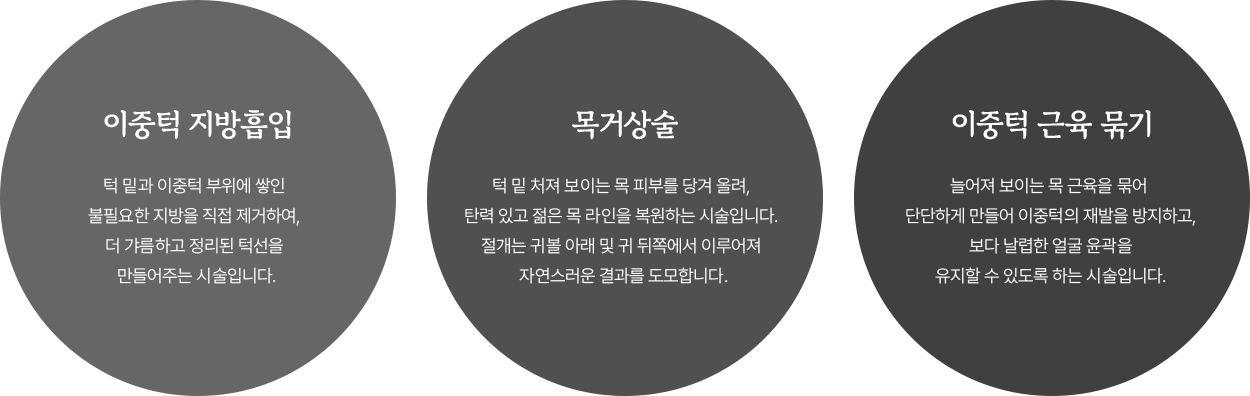 턱과 목이 조화롭게 연결되어 얼굴 전체의 균형을 맞추며, 불필요한 지방이나 늘어진 피부 가 없어야 됩니다.