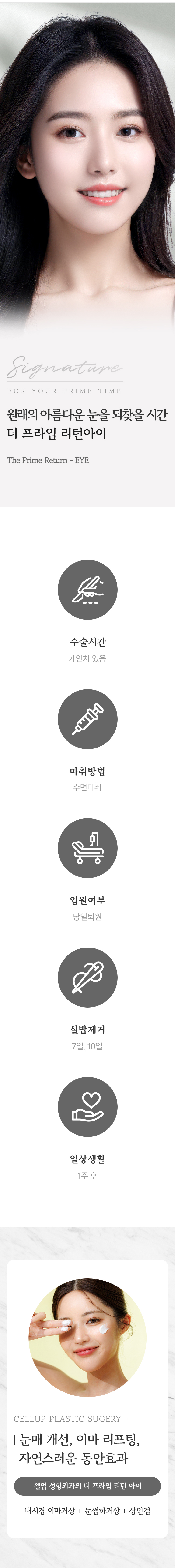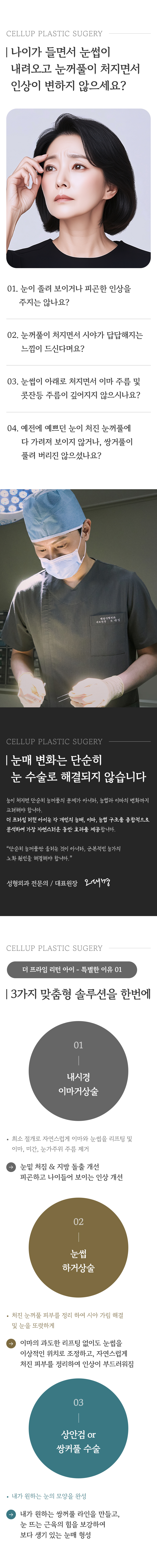 셀업성형외과는 오대명 원장님의 1대1 맞춤 진료를 원칙으로 1일 1인 수술 예약제와 책임 보증제를 운영하고 있습니다.