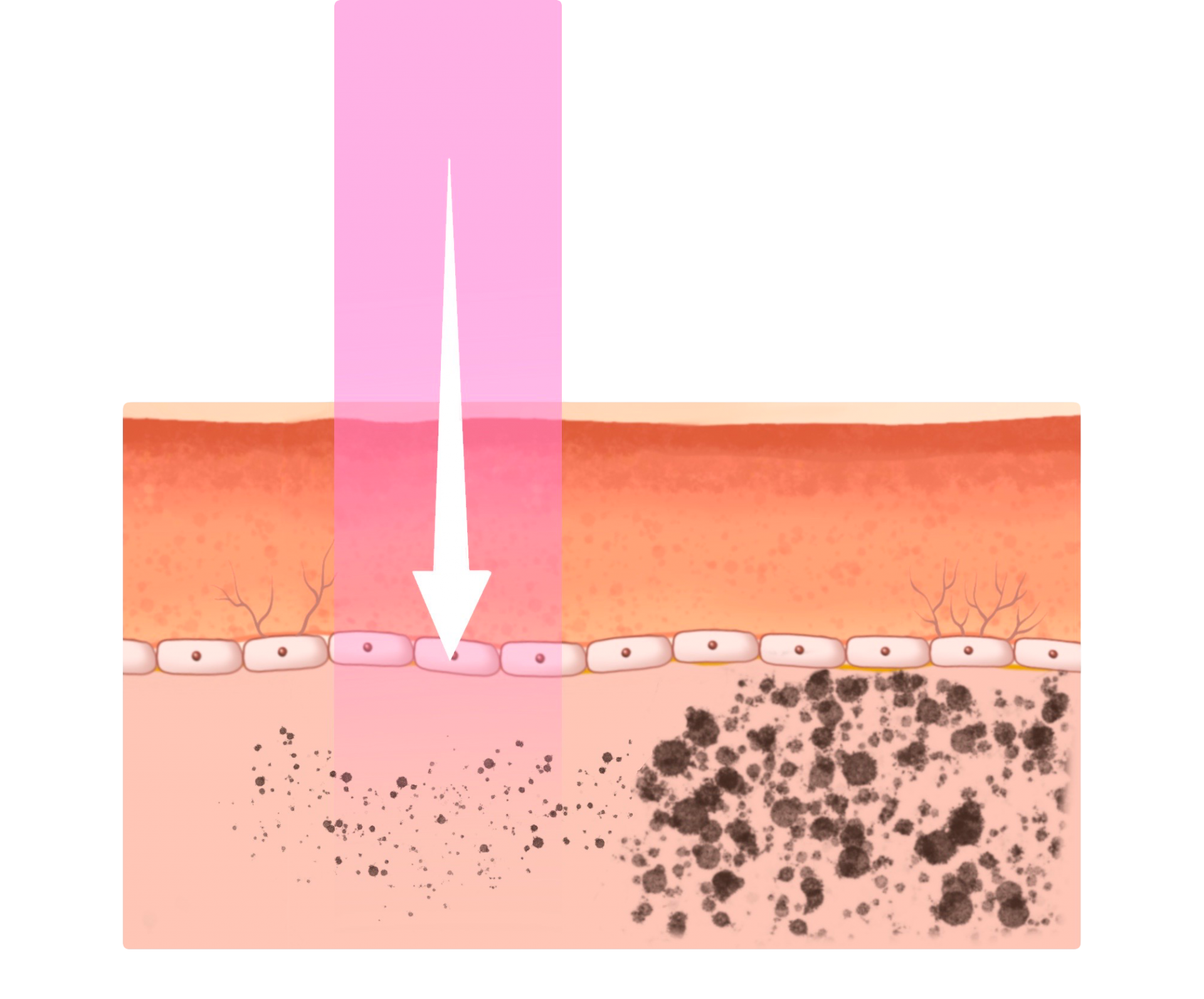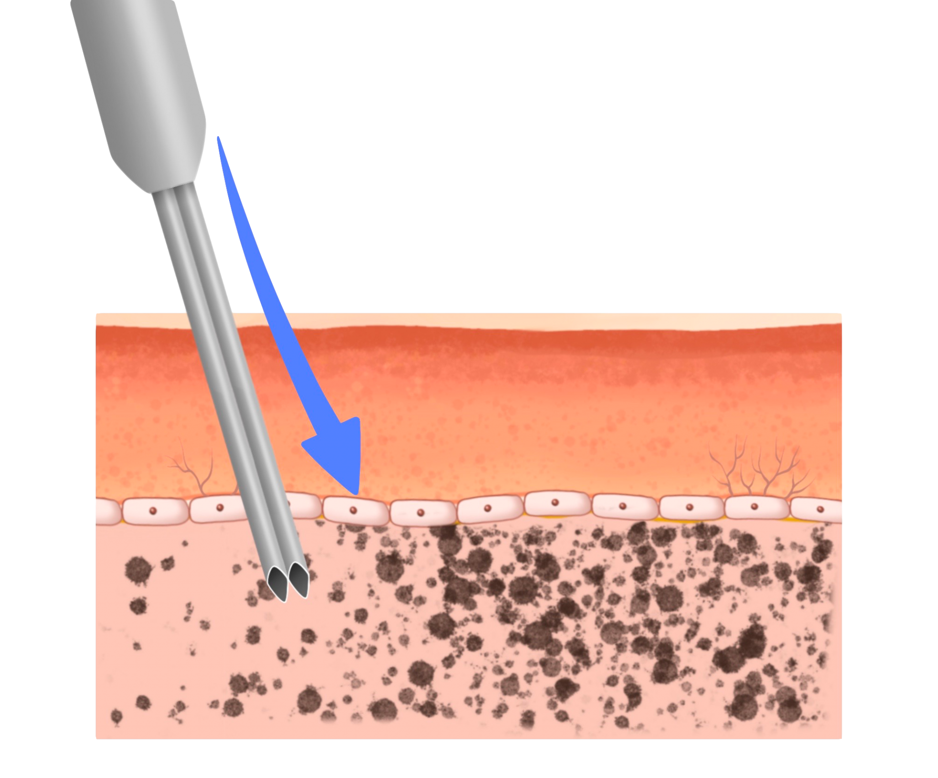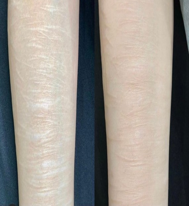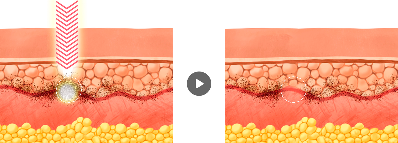 피부 속에 전용 니들을 찔러 넣어 액체 형태의 문신이나 반영구화장 색소를 주입하면 색소는 비스킷같이 단단하게 굳어져 자리를 잡게 됩니다. | 비스킷같이 단단하게 굳어져 있는 색소에 피코초, 또는 나노초 방식의 피부레이저를 조사하면 충격에너지에 의해 색소가 잘게 부서져 사라지게 됩니다. |