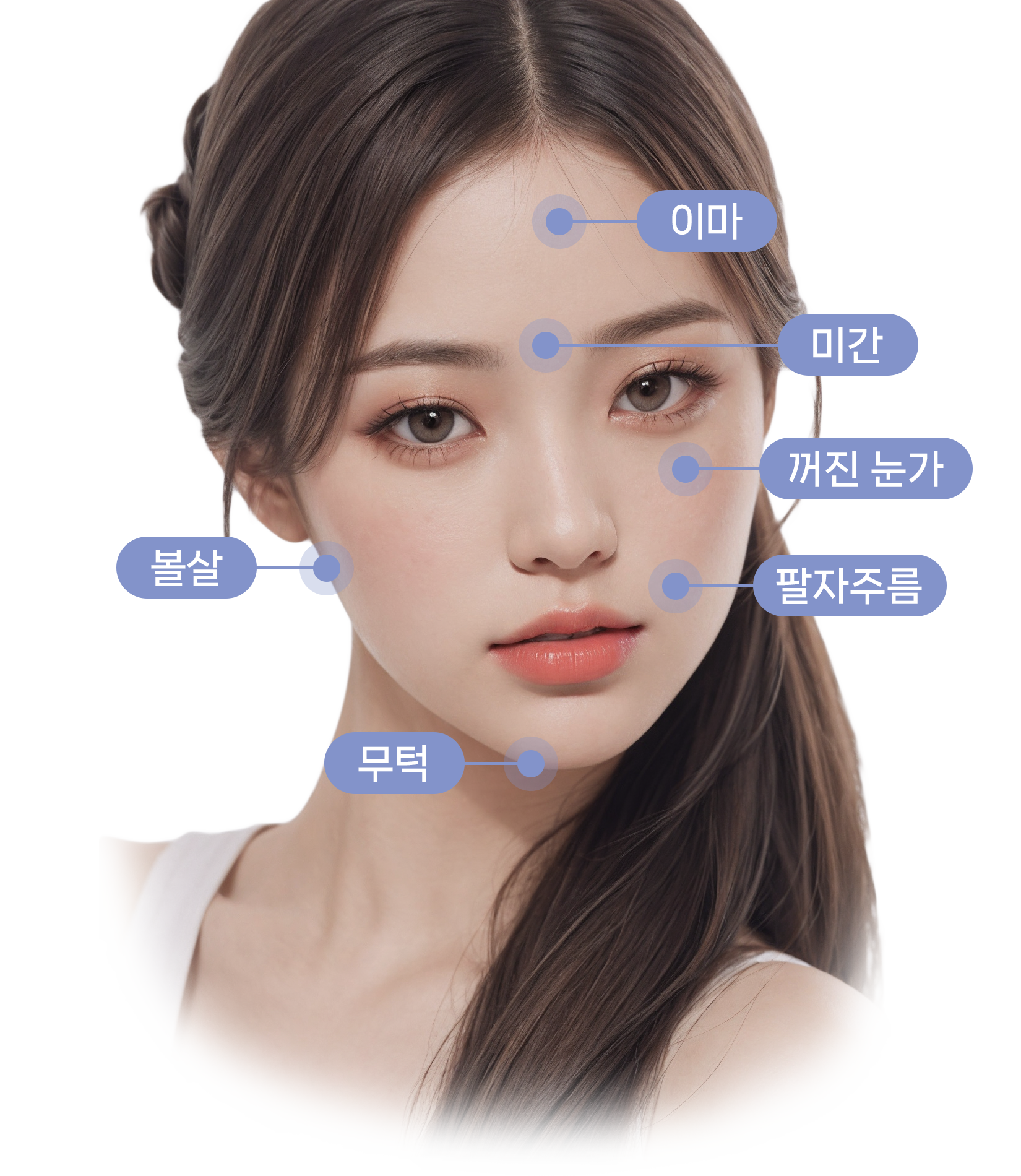 시술이 필요한 부위에 주입하여 볼륨있는 동안얼굴로 개선합니다.