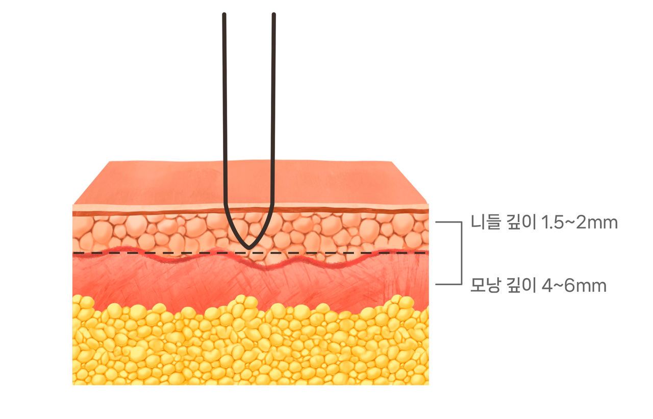 시술 시 니들의 깊이는 표피 상부층까지만 주입되기 때문에 마취 없이도 시술 가능한 미미한 통증입니다. 시술 후 3~4일간 샴푸를 할 수 없 고 땀 흘리는 운동이나 수영 사우나는 피해야 합니다.